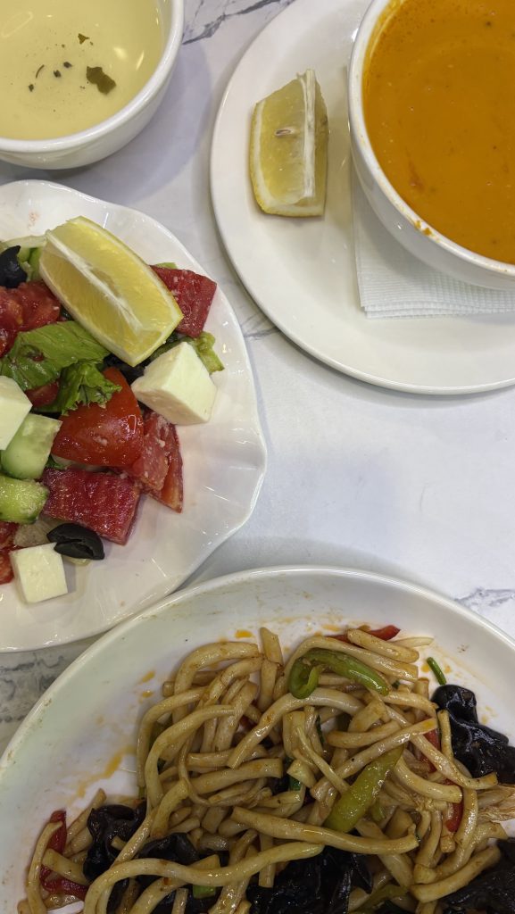 It’s not on the menu, but I read from other travelers that you can order the traditional lagman noodles with no meat. Yes, they just pick out the meat for you ( which I know bothers some veg heads out there), but what you’re left with is chewy hand-pulled noodles and oyster mushrooms in an oily delicious sauce!