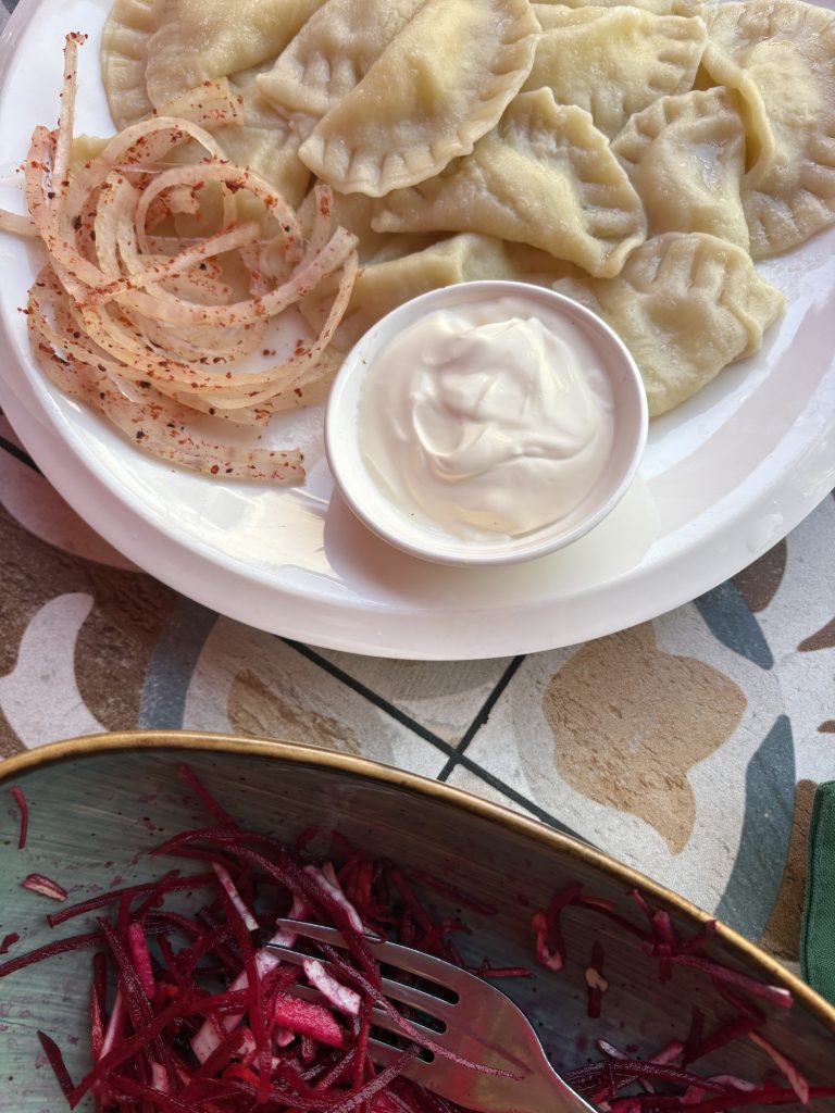 Cross back to head towards Чайхана NAVAT for lunch. There’s a large outdoor patio to enjoy or you can soak in the colorful, pattern filled interior. Warning: the menu here ( like many other Asian restaurants in the area) is HUGE. I only looked through about 1/3 of the menu before the waitress took our order but we did enjoy the potato dumplings and salad that we got!